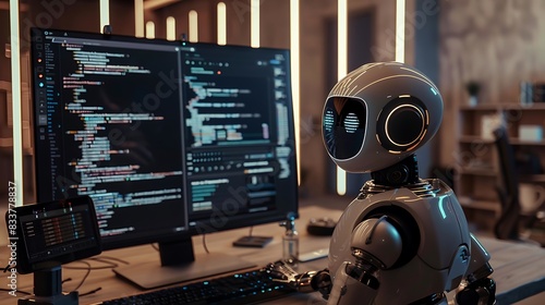 A futuristic robot sits at a desk in a modern office, looking at code on a computer screen. The robot is designed for AI and technology concepts.