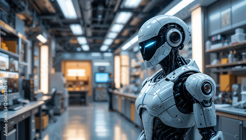 A Futuristic Robot Standing in a High-Tech Laboratory