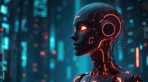 A futuristic robot with glowing, complex circuitry patterns, standing in a high-tech digital environment, symbolizing advanced AI and innovation.