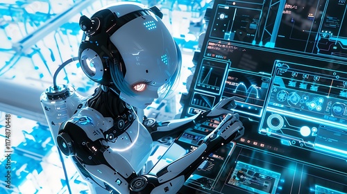 A futuristic robot working on advanced machine learning algorithms, visualizing AI-driven predictions and deep learning results on multiple digital screens.