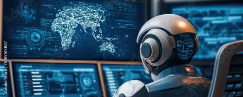 A futuristic scene depicting a robot observing a digital world map and data displays on a high-tech control panel.