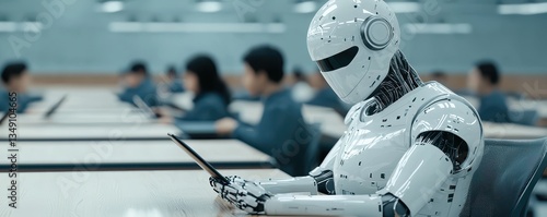 A futuristic scene featuring a humanoid robot using a device while people work in the background, symbolizing technology and human interaction.