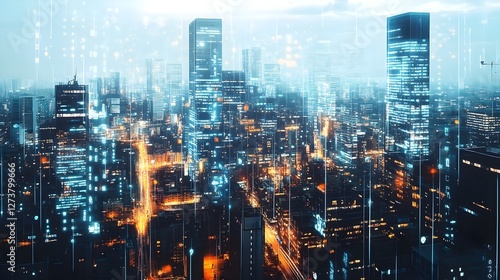 A futuristic smart city illuminated with glowing digital networks. concept for smart cities and transport, modern urban connectivity, digital transformation, IoT integration, AI-driven infrastructure