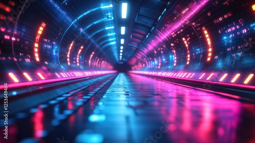 A futuristic tunnel illuminated with vibrant neon lights and reflections on a wet surface.