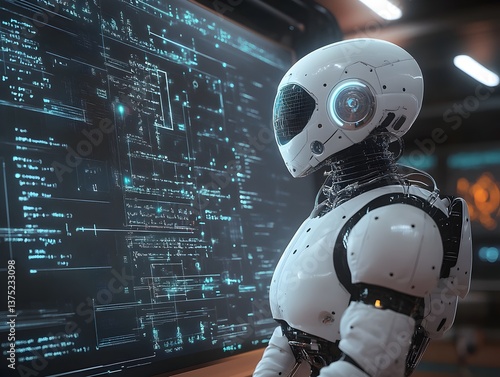 A futuristic white robot examines complex digital code displayed on a large screen in a high tech laboratory setting.