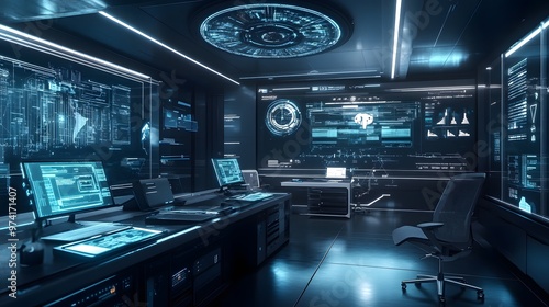 A futuristic work environment where blockchain-secured devices and IoT systems optimize productivity and connectivity