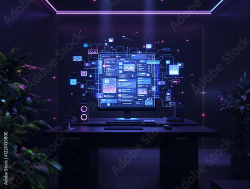a futuristic workspace with a large screen displaying various digital interfaces and data. The environment is illuminated with a neon blue glow, and there are plants in the background, adding a touch