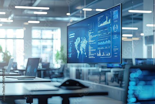 A Glimpse into the Future of Work: Modern Office with Smart Technology and Global Data Visualization.