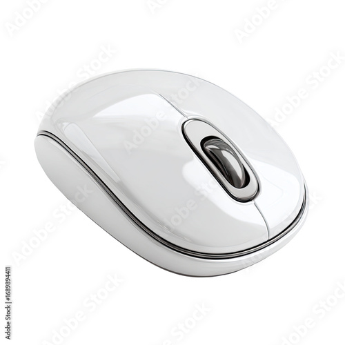 A glossy white computer mouse, angled view. Rounded, ergonomic design, with a central button