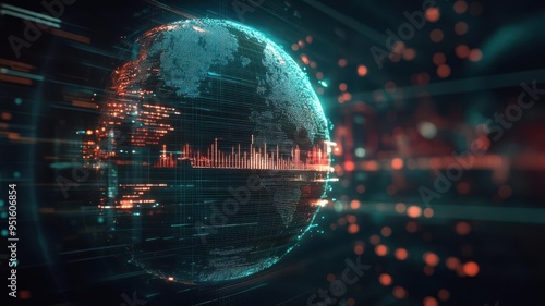 A glowing AIpowered predictive model visualized as a holographic globe with data points, symbolizing global forecasting and analysis