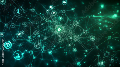A glowing blockchain network visualization with interconnected nodes, cryptocurrency symbols.