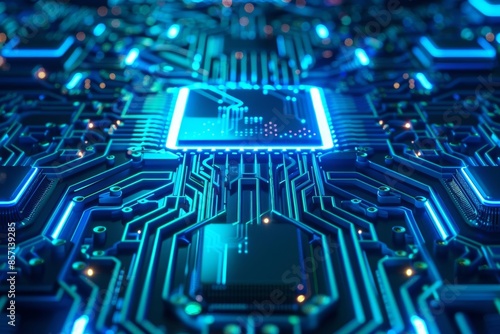 A glowing blue circuit board with intricate tech patterns, representing AI processing, front view, emphasizing advanced computing, sci-fi tone, Vivid Color Scheme
