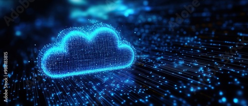 A glowing blue cloud icon surrounded by digital particles, symbolizing cloud computing and data transfer in a futuristic setting.