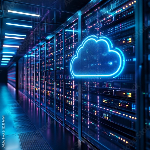 A glowing blue cloud-shaped hologram in a futuristic data center with servers, symbolizing cloud computing, big data, and technological innovation.