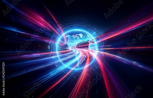 A glowing blue digital Earth surrounded by concentric circles on a black background.