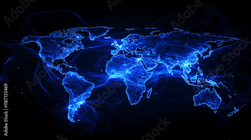 A glowing blue digital world map with interconnected points and lines displayed on a clean light background symbolizing technology and data