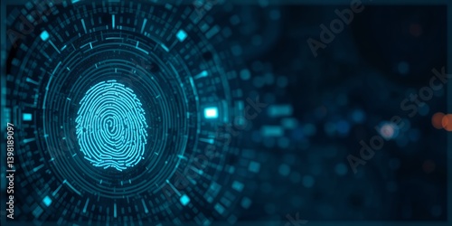 A glowing blue fingerprint inside a circular tech interface against a dark background with bokeh effect