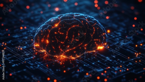 A glowing brain rendered in digital circuits, symbolizing technology, artificial intelligence, and cognitive science.