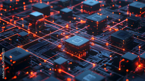 A glowing circuit board illuminated with orange lines and nodes, symbolizing interconnected digital systems and data networks.