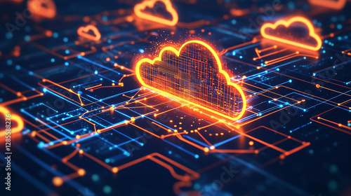 A glowing cloud icon connected to multiple devices, illustrating cloud-based data sharing, AI-driven services, and digital transformation.