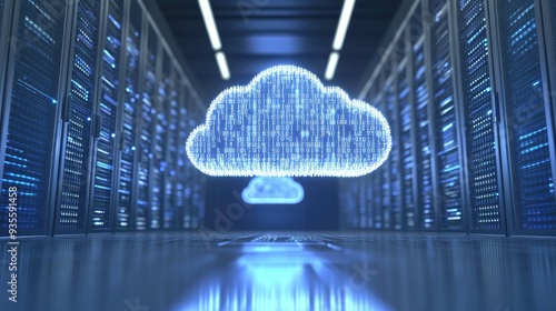 A glowing cloud symbol formed from binary code floats in the middle of a server room.
