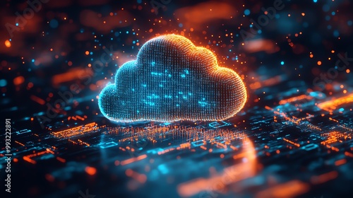 A glowing cloud symbol on a dark, digital background representing data storage and cloud computing.