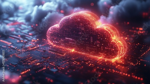 A glowing cloud symbol over a circuit board, representing digital technology and data storage.