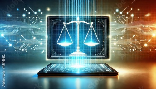 A glowing computer screen displaying a balanced scale with human values and algorithms symbolizing fairness and responsibility in ethical AI.