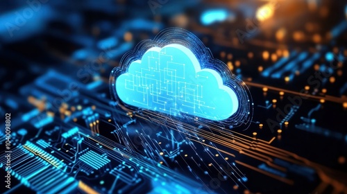 A glowing digital cloud icon hovers above intricate circuitry, symbolizing cloud computing and data integration in modern technology.