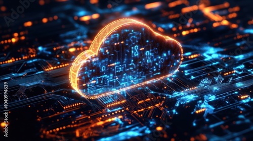 A glowing digital cloud icon hovers above intricate circuitry, symbolizing cloud computing and data integration in modern technology.
