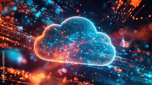 A glowing digital cloud surrounded by vibrant data streams, symbolizing secure cloud computing, data storage solutions, and digital file sharing.