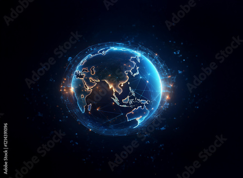 A glowing digital globe, showcasing interconnectedness. Lines of light pulse across its surface, representing global networks and data flow.