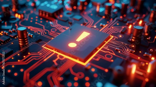 a glowing Exclamation mark symbol displayed on a microchip . technology concept.