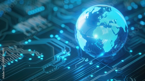 A glowing globe on a digital circuit board, representing technology, connectivity, and global networking.