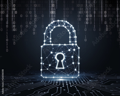 A glowing lock symbol connected by digital lines with binary code in the background, representing cybersecurity, data protection, and encryption technology.