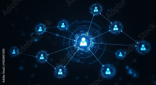 A glowing network of people icons connected by lines on a dark blue digital background display screen
