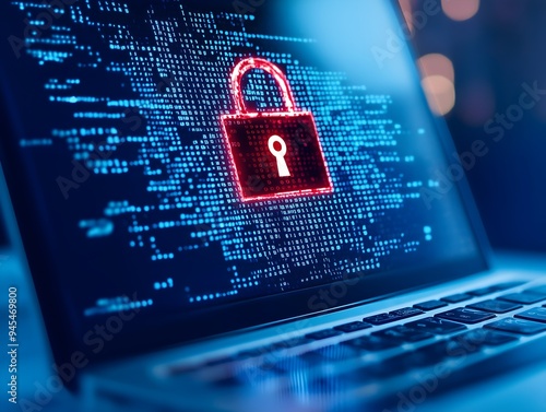 A glowing red padlock icon on a laptop screen with blue digital code in the background, symbolizing cybersecurity and data encryption.