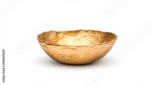 A gold bowl with a rough texture sits on a white background. The bowl's design and color create a sense of luxury and elegance