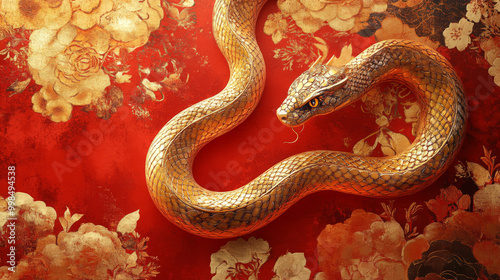A gold colored snake is laying on a red background with flowers