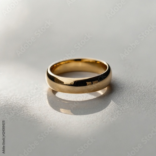 A gold wedding ring resting on a smooth white surface, capturing reflections.