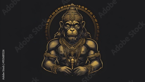 A golden illustration of Hanuman, the Hindu god of strength and devotion, against a black background.