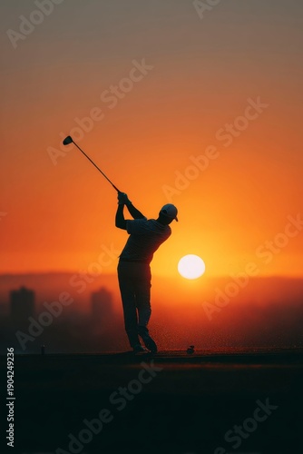 a golf player in motion, with a blurry background and a sunset.