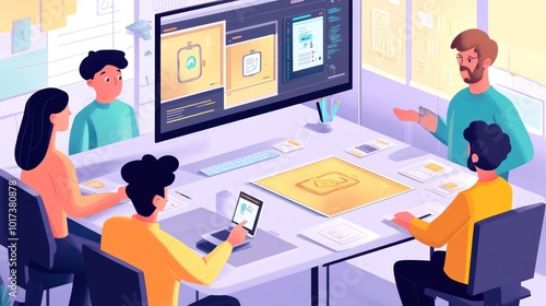 A group brainstorming around a table, with multiple iterations of a tech gadget prototype in front of them, as they refine the design with virtual mockups on a large screen.