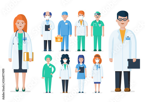A group of doctors, nurses, and orderlies. A team of professionals to prevent the spread of viruses. Set of medical characters. Flat vector cartoon illustration of medical staff