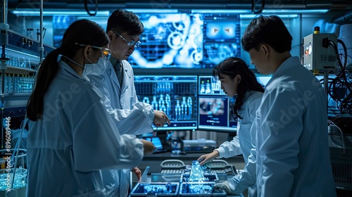 A group of engineers in a high-tech lab, working together on a complex robotics project. They are surrounded by sophisticated equipment and monitors displaying technical data, showcasing their