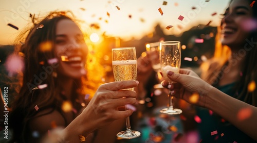 A group of friends clink champagne glasses amidst a shower of colorful confetti, celebrating joy and friendship in a sunlit outdoor setting, filled with laughter and excitement.