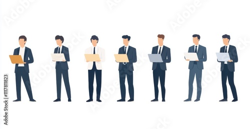 A group of men in suits are standing in a line, each holding a laptop. Concept of professionalism and focus, as the men are likely working or attending a business meeting