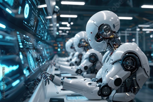A group of robots is lined up in a neat row, with each one sitting in front of a large monitor, AI robots working in a futuristic IT lab, AI Generated