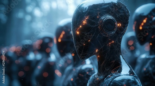 A group of robots learning through machine learning algorithms, visualized as glowing neural networks, AI, Digital Art, Clean and futuristic