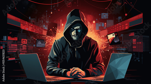 A guy works at a computer. Illustration hacker.